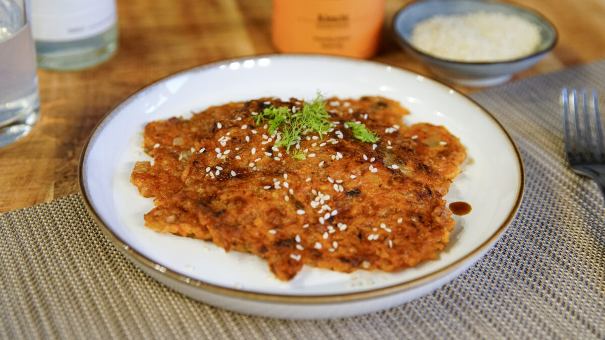 - Ist der Pancake von beiden Seiten goldbraun und knusprig, kann der Kimchijeon aus der Pfanne genommen werden.