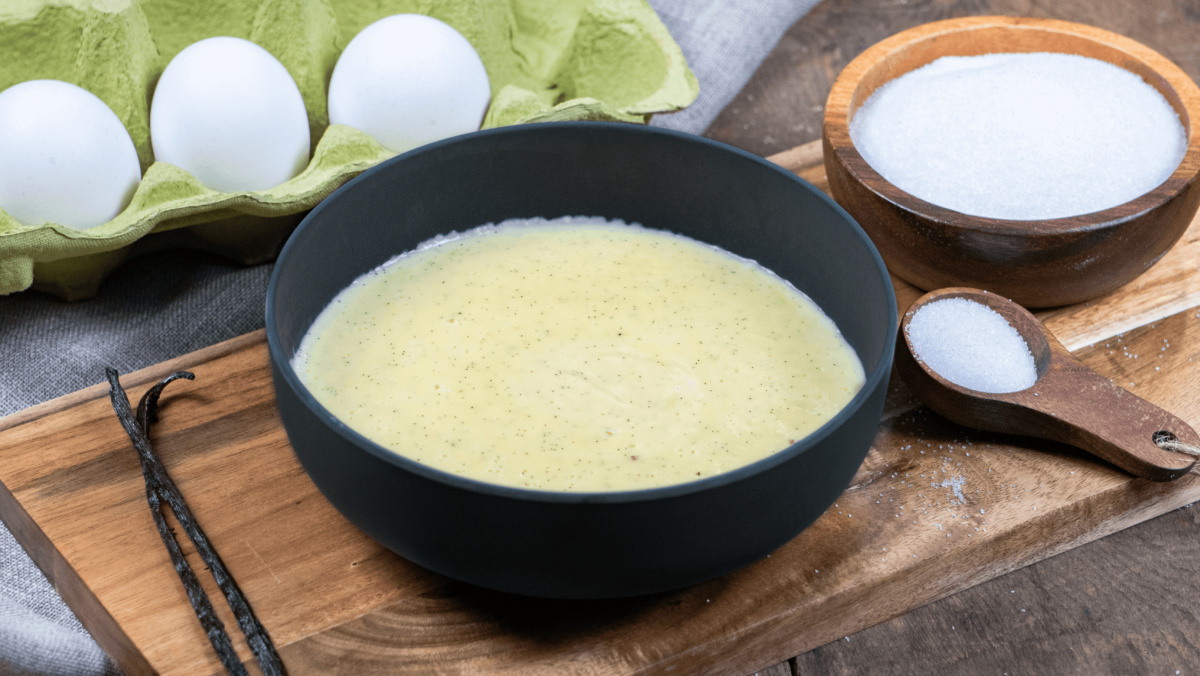 Für die Sauce bedarf es nämlich kaum Zutaten, die man nicht sowieso schon Zuhause hat. Zucker, Eier, Milch und Sahne sind die Hauptbestandteile – für die selbstgemachte Dessert-Sauce fehlt dann nur noch die namengebende Vanille-Schote.